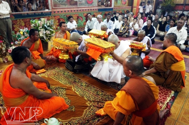 Los jemeres realizan la ceremonia del baño del Buda, lavando con agua perfumada las estatuas de buda, y luego las manos y los pies del bonzo gerente de la pagoda de su comunidad. Los niños también echan esta agua aromática al cuerpo de las personas mayores, creyendo que practicando el ritual sagrado tendrá una vida longeva y feliz.