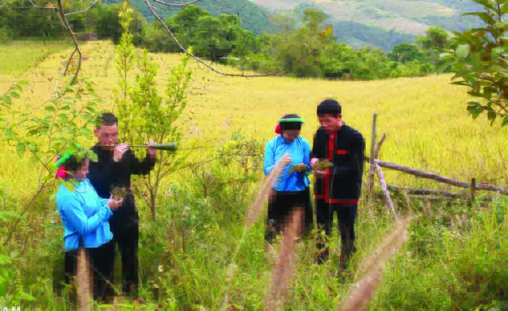 Los muchachos y las muchachas de la etnia San Chi entonan melodías de Sóong Cọ en la colina. (Foto: vannghequandoi.com.vn) |