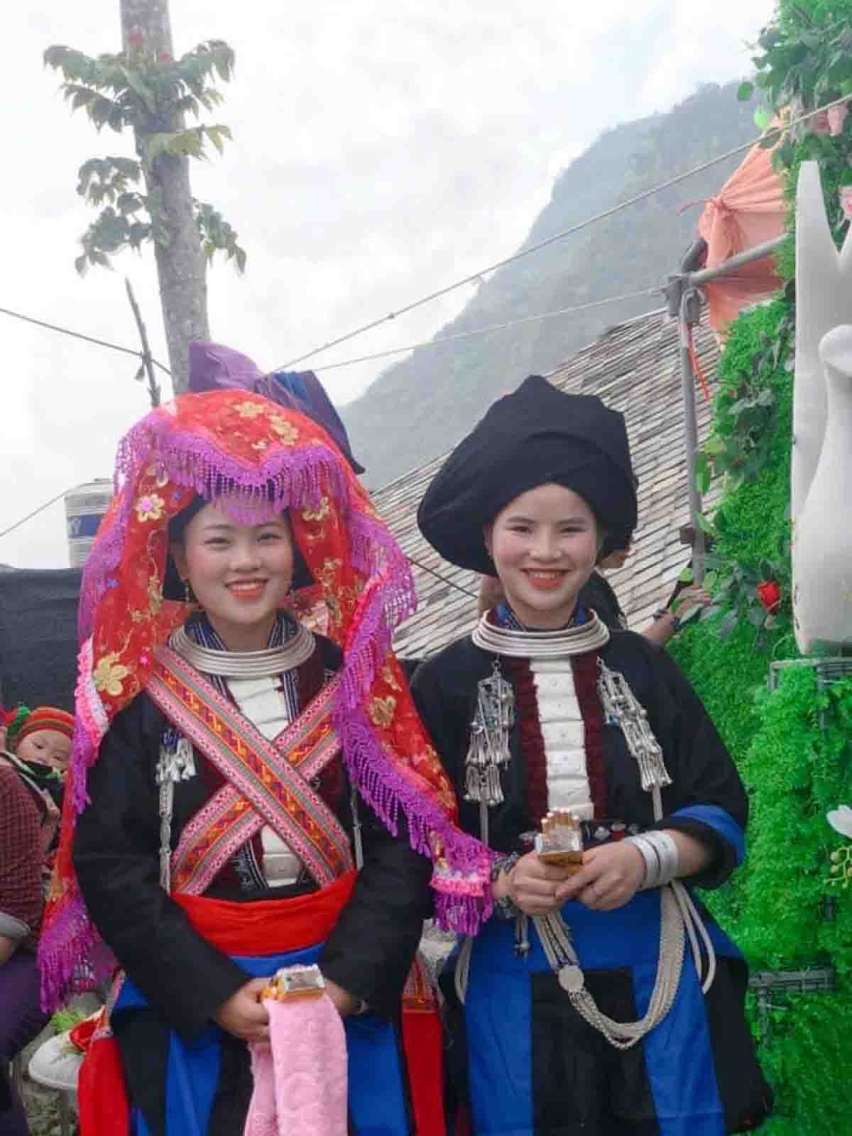 Tan My Xoang, casamentera en la comuna de Ta Phin, distrito de Sin Ho, dijo lo siguiente: “Además de la ropa de boda que usa, la novia agrega dos bandas de tela roja de unos cuatro metros de largo colgadas de forma diagonal del hombro a la axila formando una flor en el costado, mientras las partes restantes de tela se dejan caer al suelo. Se usa también otra banda de tela roja más corta enrollada desde el frente del abdomen hacia atrás, atada, y los otros dos extremos se dejan caer hasta los talones. Por su parte, el novio lleva una túnica azul larga hasta las piernas. También lleva cintas rojas como la novia y en la cabeza lleva un pañuelo rojo con una flor en la frente. En cuanto a las ofrendas, la novia lleva en la cabeza una bandeja de madera ligera en forma de trapezoide isósceles. Los dos lados y bajo el fondo de la bandeja se cuelgan borlas de color rojo intenso con cuentas, mientras la parte superior de la bandera está cubierta con un paño rojo, bordado con patrones, y se inserta una rama plateada en el medio. Esta bandeja la tiene que llevar la novia durante su viaje a la casa del novio hasta entrar en la habitación de pareja. Cuando comienza el ritual, la novia continúa llevando la ofrenda en su cabeza”.