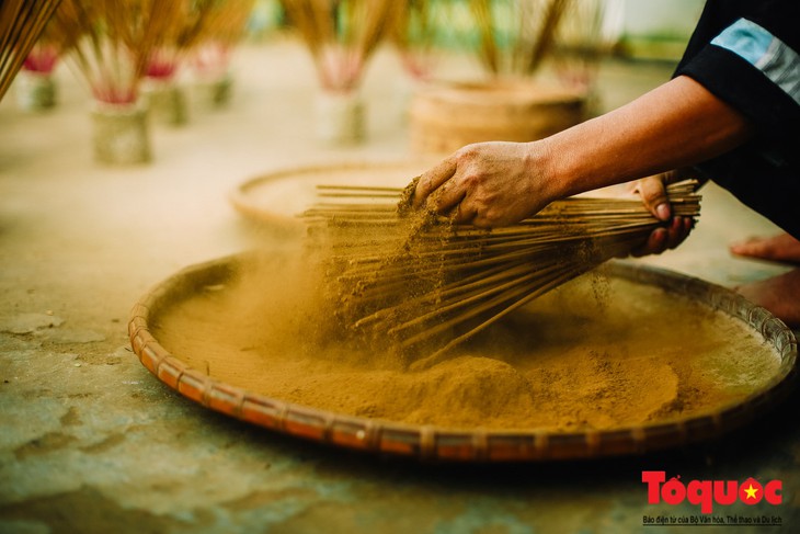 Según los Nung An, no es difícil elaborarlos, pero el oficio requiere varios pasos. El tronco del árbol llamado “mai” es cortado en trozos de 40 centímetros y luego divididos en barritas. Mientras, la madera de la panacea molida sirve para crear el color. Los palillos pueden teñirse antes o después de llevarse a secar. Una vez secos, son mojados en el adhesivo hecho de la hoja de la planta “bau hat” antes de ser enrollados 4 veces en una mezcla de aserrín y polvo de madera de agar. Los artesanos deben enrollar rápidamente las varillas para garantizar la adhesión y la uniformidad del polvo, así como el aroma y la estética de los palos quemados. El secado también se realiza de manera natural, sin recurrir a ningún equipo auxiliar o sustancia química. Las barritas de inciensos son secadas normalmente durante un día, en tubos de cemento o sobre los campos.