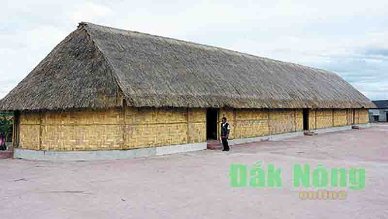 Los autóctonos M'Nong en particular, y la gente de las Tierras Altas Centrales en general, tienen la tradición de construir casas en dirección norte-sur para recibir la brisa y evitar el calor del sol. La casa suele estar hecha al estilo de cuatro techos. La puerta de la vivienda se abre en la parte superior del porche izquierdo, creando un ambiente acogedor y discreto. El espacio en la casa alargada está dispuesto en un orden prescrito: el almacén de arroz está arriba; la cocina, en la parte inferior, y los dormitorios se encuentran en ambos lados. El almacén de arroz de cada hogar está ubicado al final de la fila, uno tras otro. Cada granero tiene su propia escalera para subir y bajar. A los dos lados de la puerta del granero, hay dos ollas grandes para guardar semillas de arroz. Cuando se agota la reserva, se saca el arroz de la olla para comer. Nada más entrar en la vivienda, se encuentra un hornillo, destinado a los hombres e invitados. Otro ubicado cerca del granero es para las mujeres y las niñas encargadas de cocinar. En la casa hay dormitorios con camas para abuelos, padres, hijas, hijos, propietarios e invitados.
