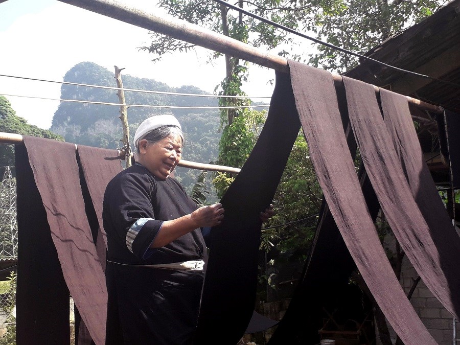 El primer paso es teñir la tela. Las ramas y los tallos de añil son cortados y macerados en agua unos días hasta dar una pasta de color azul oscuro intenso. La coloración se realiza con esta masa, disuelta en agua a proporción del gusto de cada uno. Normalmente, una tela de 9 o 10 metros de largo es remojada durante una hora en ese líquido y luego secada bajo el sol durante el mismo tiempo. El proceso se repite durante un mes hasta obtener un color índigo uniforme. El secreto consiste en la cantidad de cal que se le echa. Según Luong Thi Xuan, de la etnia Nung y radicada en el distrito de Quang Yen, provincia de Cao Bang, el resultado de la coloración depende mucho de este paso, ya que puede dar un color menos o más oscuro.