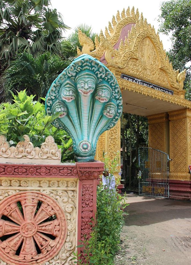 Al pasar por su entrada, el visitante se verá atraído por el color amarillo brillante del santuario. Los diestros artesanos jemeres crearon un complejo religioso sin par con tejados de color de dos niveles, esculturas sofisticadas de la serpiente Naga y una torre puntiaguda. Tallaron en los pilares que sostienen la pagoda la figura de la hada Kemnar con dos manos juntas en su pecho. Los rasgos culturales más característicos del pueblo jemer se ponen de manifiesto en el santuario principal, especialmente la estatua del Buda Gautama cubierta por un baño de oro. Hoang Viet explicó: