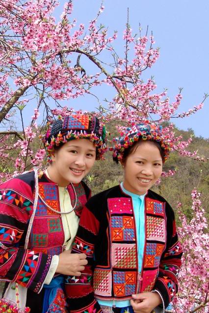 ![]() Dos muchachas de la etnia Lo Lo lucen lindas en el traje tradicional para la fiesta primaveral de su pueblo