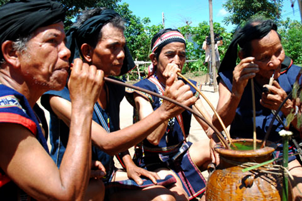 Étnicos Ba Na beben aguardiente mediante la caña de pesca