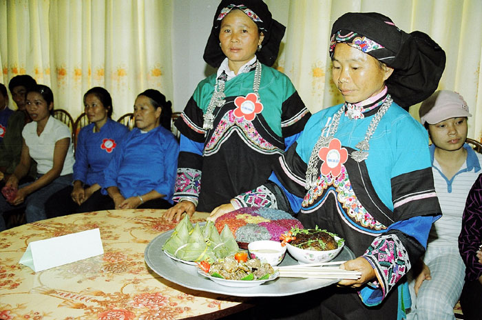 ![]() Dos mujeres Bo Y con la bandeja de comidas elaboradas para la Fiesta del Año Nuevo