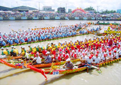 Los jemeres en el sur llevan una rica vida cultural y espiritual, reflejada en un gran número de festividades tradicionales, entre ellas las más importantes son Chol Chnam Thmay, la Fiesta del Año Nuevo y Ok-ang Bok, la fiesta del culto a la luna, en la que se organizan competencias de “ghe ngo” (barcos de remo) entre los “phum” y “soc”. Chol Chnam Thmay que se efectúa en abril constituye una fiesta de gran júbilo de toda la comunidad jemer, en la cual se felicitan, se visitan mutuamente y realizan diversas actividades culturales y deportivas. Esta fiesta del año nuevo del grupo étnico jemer tiene rasgos muy particulares, como lo que confirma Chau On, del Seminario Budista de la vertiente Nam Tong Jemer. “La forma en que los jemeres reciben el Año Nuevo es muy diferente a la de los vietnamitas (o kinh) y de los chinos. Este momento es calculado según el movimiento del sol, es decir según una fecha y una hora predeterminada por los Hora Cha, cuyo pronóstico se basa en la dirección por la cual avanza el sol, por eso cambia según el año. Entonces, a esa hora y en esa fecha los pobladores se reúnen en la pagoda y tocan los tambores para invocar al buda, realizar la procesión de su estatua y festejar el Año nuevo.”