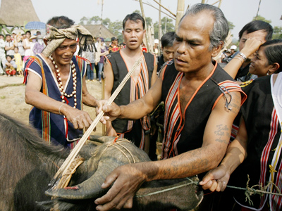 El patriarca hace procedimientos religiosos para sacrificar el búfalo
