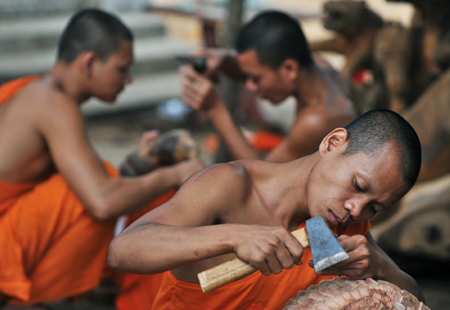 ![]() Jóvenes jemeres aprendiendo el tallado sobre madera en la pagoda Hang, en Tra Vinh