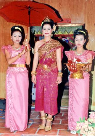 Debido a que los jemeres mantienen aún el matriarcado, el casamiento suele realizarse en la casa de la novia. Desde tempranas horas de la mañana, la delegación de la familia del novio, encabezada por el celebrante, lleva los obsequios a su homóloga, entre ellos joyas y bufandas. Antes de la llegada de la delegación, la familia de la muchacha cierra la entrada de la casa con ramas espinosas de un árbol que simboliza la pureza y su virginidad. Una vez que se acerca a esta puerta, el representante de la delegación de la familia del novio hace tres círculos en el aire con una espada de madera. Entonces, los padres de la novia tocan gongos para darles la bienvenida. Luego, se entregan guirnaldas de flores y entran juntos en la casa en el ambiente de música y felicitaciones.