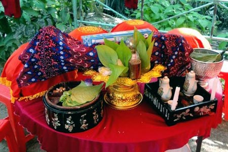 La ceremonia de pedido de mano se efectuó en la casa de la muchacha. Los presentes de boda entregados por la familia del novio incluyeron bandejas de betel y areca, flores, frutas y pasteles “tet”, hechos de arroz glutinoso, carne de cerdo y frijol verde. Se entregó en la ocasión una suma de dinero para facilitar las compras de la novia antes de ir a vivir en la casa de su esposo. La música tradicional de cinco tonos “ngu am” pareció acentuar más el ambiente solemne de la ceremonia de pedido de mano.