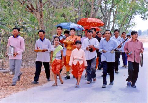 Para comenzar los ritos del pedido de mano, dos celebrantes, llamados en idioma jemer Achar, dijeron algunas palabras. Los Achar son personas prestigiosas en la comunidad, conocedoras de la cultura y las costumbres tradicionales y tienen familias felices. Chau Chan Da, padre del novio, comentó: “Invitamos a las personas decentes y conocedoras a celebrar el pedido de mano y demás pasos de las ceremonias nupciales de mi hijo. Los ritos tradicionales requieren determinados conocimientos y capacidad.”