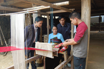 A principios de mayo lunar, los Muong empiezan a recoger y secar algodón para hilarlo. Según su costumbre, antes de casarse, una joven Muong debe tejer de 6 a l2 frazadas y colchones como regalos a los familiares de su futuro esposo, mostrando poseer habilidad y laboriosidad. Por ello, en la región Muong casi todas las familias poseen telares y las niñas de l3 a l4 años de edad ya dominan bien este oficio. La estructura del telar de esta etnia tiene muchas tramas capaces de crear distintos diseños. Después de hilar se debe almidonar y secar el producto. Si se trata de un tejido blanco y simple, una persona puede urdir de 7 a l0 metros al día. En el caso de confeccionar diseños, solo puede entrelazar de 2 a 3 metros al día. Nguyen Thi Sen, habitante del poblado Tan Tien, comuna Dan Chu, ciudad de Hoa Binh, dijo: “Una vez hecho el tejido se empieza a teñir telas. Los colores son procesados de las plantas de los bosques. Por ejemplo, se emplea el azafrán para crear el color amarillo y el añil para el negro. La confección de la tela necesita mucho tiempo y fuerza. Como tejemos a mano, los brocados son muy estables y no se destiñen.”
