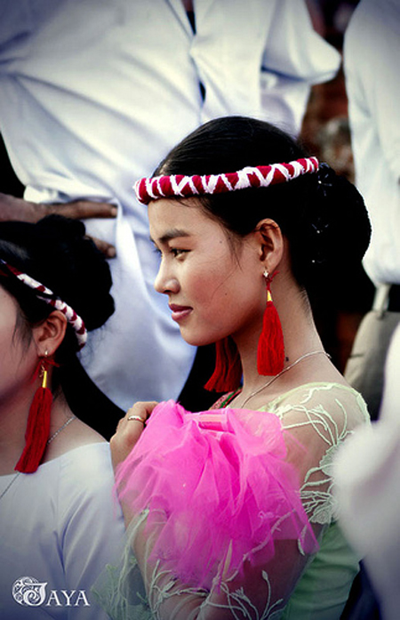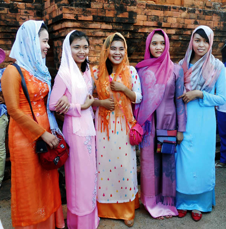 El atuendo de las muchachas Cham incluye la túnica, la falda y la bufanda