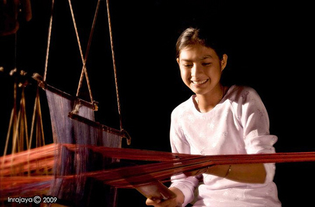 Una muchacha Cham vestida de "Áo dài" teje brocados, su trabajo cotidiano