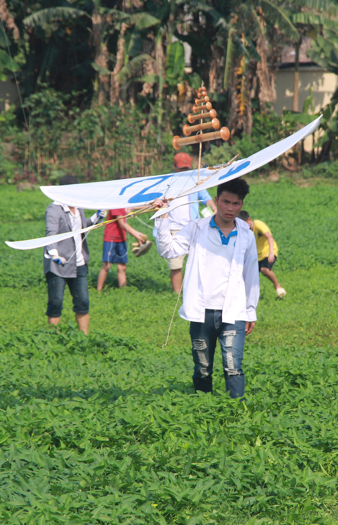 Construir barriletes con flautas es todo un arte y requiere muchas experiencias, habilidades y tiempo, sobre todo si desean participar en la competición del 15 de marzo lunar. Hay quienes comienzan a hacerlo 8 meses antes. Nguyen Van Dong, radicado en la aldea de Ba Duong Noi, dijo: “Normalmente preparamos el bambú para hacer la estructura de las cometas desde el año anterior. En cuanto al amarre, usamos un hilo de 800 a 1200 metros. Los papalotes no vuelan en dirección vertical, por lo que la máxima altura que pueden alcanzar varía de 500 a 600 metros. Los que figuran en el top 7 a veces superan las nubes, y hay que esperar que se dispersen para poder ver esos puntitos en el cielo. Mientras, las flautas deben sonar nítidamente, con eco y ritmo, como si fuera un concierto en el aire. Mi equipo está compuesto por seis miembros, y participamos en el festival todos los años. Las cometas de mi aldea suelen ganar primeros premios”.