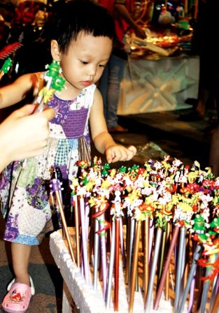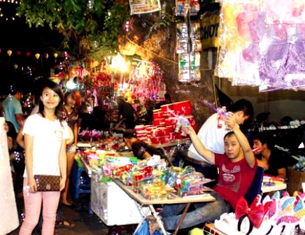 El mercado en las calles de Hang Ma y Hang Thiec estuvo muy movido. Aquí se vendieron distintos juguetes, sobre todo las lámparas de medio otoño. Por la noche los faroles de estrella, conejo y otras figuras hechos de celofanes multicolores iluminaron toda la zona, haciendo más efervescentes las actividades de comercio. Vu Nhat Quang, residente del distrito de Hai Ba Trung que llevó a su hija a pasear por esta zona dijo: “Llevo a mi hija a recorrer la calle de Hang Ma y otros barrios de Hanoi. En todos los lugares percibimos un ambiente muy jocoso”.