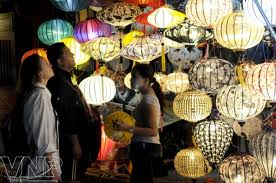 Viajeros extrajeros contemplan lampara de seda en la antigua ciudadela de Hoi An