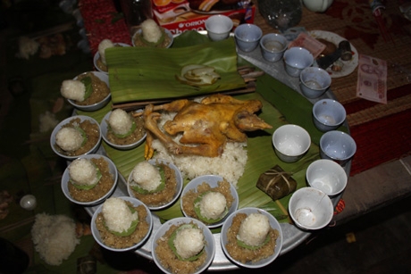 Mientras sus familiares preparaban la bandeja de alimentos para ofrendar a los antecesores, Khan fue al huerto y cortó el ramo de melocotón más bonito para colocarlo al lado del altar. También escogió todas las demás flores que están puestas. Reveló que los Muong eligen las flores rojas para el Tet, porque este color les traerá buena suerte. La bandeja de manjares en honor de sus ancestros también fue adornada acorde con los hábitos tradicionales. Khan continuó: “Los platos se colocan sobre una hoja verde de plátano cortada de su copa. En tiempos remotos, debido a la falta de utensilios, los antepasados colocaban las comidas sobre estas hojas. Hasta ahora esta práctica todavía se mantiene y solo la sopa se echa en la escudilla.”
