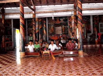 En las vacaciones, los alumnos jemeres llegan a Chua Doi para practicar la música pentatónica, ya que en el año escolar solo se entrenan los sábados y domingos. El mayor de ellos tiene l5 años y el más pequeño, 6, y todos tocan apasionadamente instrumentos musicales tradicionales. Do Minh Duong de l5 años de edad, alumno del séptimo grado, enseña minuciosamente a los más pequeños. “En los fines de semana ofrecemos conciertos a los visitantes. Aquí hay también maestros, pero los mayores son instructores principales. La música que acaban de oír se llama “am tu” y es una pieza triste que se interpreta en los funerales”.