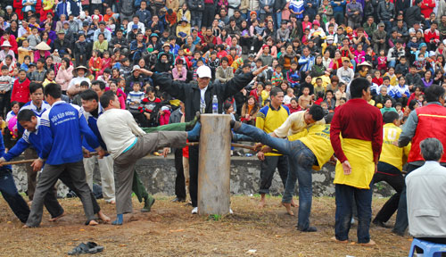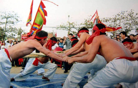 La fiesta primaveral de la aldea de Huu Chap, de la comuna de Hoa Long, de la ciudad de Bac Ninh comparte rasgos comunes con otras festividades tradicionales de Vietnam. Sin embargo, lo especial radica en que el juego de la soga se convierte en una ceremonia principal. Según cuentan los ancianos de la aldea, en el pasado, se movilizaban los hombres más fuertes para arrastrar grandes troncos de madera que servían para la construcción de la Casa Comunal y viviendas. En las celebraciones, el pueblo local evocaba esta actividad laboral, que luego fue simbolizada con el juego de la soga. La competición del villorrio de Huu Chap se efectúa cada 4 de enero del calendario lunar y hasta ahora tiene aproximadamente 400 años de existencia. Los ritos de esta festividad se llevan a cabo con toda solemnidad, además de un desfile de palanquín, para recordar la historia de la construcción de la aldea. Sin embargo, según el señor Nguyen Van Chuan, jefe de la Asociación local de personas de avanzada edad, el juego de la soga siempre es la actividad más atractiva de la fiesta.“Frecuentemente como indica el nombre del juego, los participantes de los dos lados tiran de una soga. Pero en nuestra aldea, partiendo de la leyenda sobre los traslados de madera para la construcción, la soga es sustituida por dos troncos de bambú unidos por cuerdas y sujetados en cada lado por una palanca. La competición exalta la fuerza y la resistencia de los jóvenes de la aldea. A veces para preparar esta fiesta, dedicamos meses a buscar y seleccionar los mejores troncos de bambú. Es un gran honor para la familia que tiene los bambúes seleccionados. Los muchachos que son elegidos para participar en este juego también son el orgullo de su familia.”