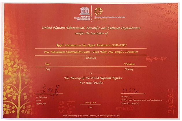 Los escritos grabados en las estructuras arquitectónicas de la Corte Real de Hue han sido archivados en formato de vídeo e instantánea por los órganos competentes de la localidad. Los contenidos de estas están traducidos en vietnamita y mantenidos en la base de datos al servicio del lector en todo el país.