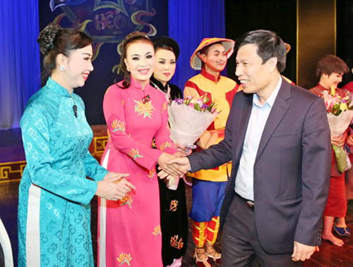 ![]() El ministro de Cultura, Deporte y Turismo de Vietnam, Nguyen Ngoc Thien (d) felicita a los actores participantes en el drama:“Nghêu, sò, ốc, hến” después de la velada en la Ópera de Hanoi