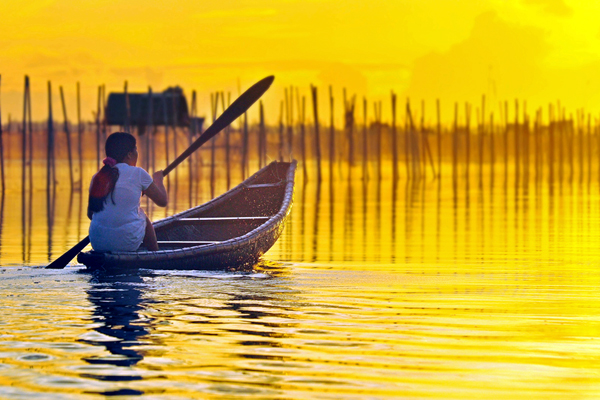 ![]() Turistas reman embarcación en la laguna Chuon