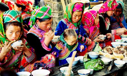 De madrugada, cuando todo el distrito de Meo Vac aun está cubierto por una capa gruesa de niebla blanca, se oye ya la voz de la gente llamándose a uno a otro e incitándose a acudir al mercado, además de ruidos del ganado que se lleva a la feria para vender. Cada vez hay más compatriotas de las etnias Nung, Dao, Mong y Giay viniendo al cruce en la Ruta Nacional 4C, o denominada también el “Camino de la Felicidad”, para llegar al mercado. La feria comercial de Meo Vac es un mercado tradicional de la localidad, que existe desde hace mucho tiempo, y mantiene hasta ahora su tradición de abrir sólo en domingo de cada mes. A lo largo del tiempo, se ha convertido en el centro de comercio e intercambio mercantil más bullicioso del distrito de Meo Vac. Hasta ahora, el evento cuenta con abundantes valores tanto económicos como culturales muy singulares de la localidad, los cuales lo diferencian de los similares de otras provincias montañosas de la zona del Noroeste del país.