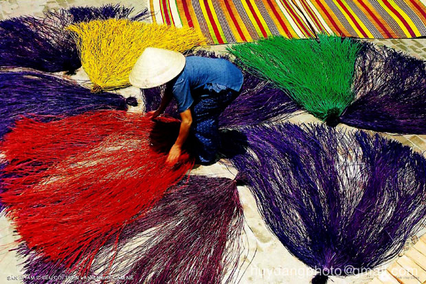 Kim Son produce dos tipos de esteras principales que son la de color blanco del esparto y la otra con la inserción de fibras de juncos multicolores, creando diseños muy hermosos. Por promedio, dos trabajadores pueden tejer un par de esteras al día.