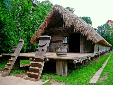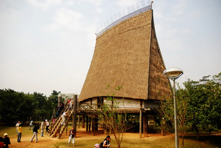Estamos ahora en el espacio de exposición a cielo abierto del Museo de Etnología. Ante nosotros, se encuentra una aldea de minorías étnicas compuesta por una docena de viviendas representativas como “nhà rông, nhà dài (casas comunas de pobladores étnicos de Tay Nguyen, en la Meseta Occidental), y también “nhà mồ” (tumba)… Se hallan además las casas típicas de los habitantes Kinh, Cham, y Ha Nhi, y otras más. El doctor Luu Hung, a su cargo, informó: “El Museo de Etnología es el primero del país dotado de un espacio de exposición a cielo abierto. Todas estas casas fueron construidas por los mismos autóctonos. La instalación de estas construcciones en el museo es un nuevo acercamiento que responde a la demanda de la sociedad y también al afán de desarrollo del museo. Estamos orgullosos de crear un espacio de exposición tan interesante para el público.”