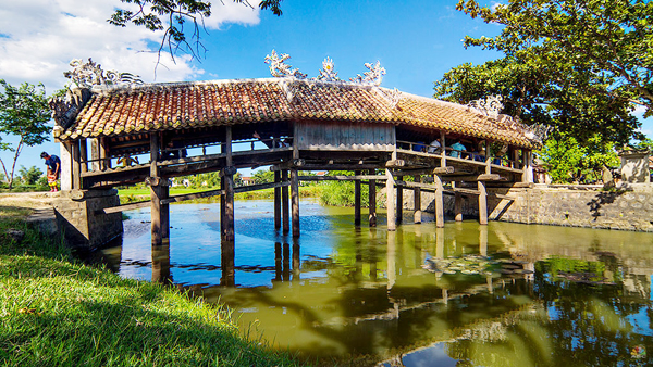 Algo muy especial de la aldea es el puente de madera de l7 metros de largo y 4 de ancho. A lo largo de sus barandas hay bancas de madera para que los transeúntes descansen. El puente está en el cruce de los ríos Thanh Toan y Nhu Y. Su techo está cubierto de tejas en forma de cilindro, esmaltadas, sobre el cual una pareja de dragones contemplan el sol. El puente se divide en 7 partes cuya arquitectura es rustica, solo con diseños redondos y cuadrados, creando belleza. La construcción es levantada por un sistema de pilares y tablas de cemento, creando una curva para facilitar la circulación de embarcaciones. Nguyen Van Thanh, habitante de Hue, dice: “El puente fue edificado por orden de Tran Thi Dao, esposa de un rey bajo la dinastía Le en el año l776.Ella no tenía hijos y veía que los aldeanos encontraban muchas dificultades al cruzar el canal. Quería pedir hijos y según la ideología budista, financió la construcción del puente para traer felicidad al pueblo. Tras el nacimiento de la obra el rey la alabó y le otorgó honores. En l920 en la época del monarca Khai Dinh, los aldeanos le rendían culto y edificaron un templo en el medio del puente. Es una construcción de madera de alto valor arquitectónico.”
