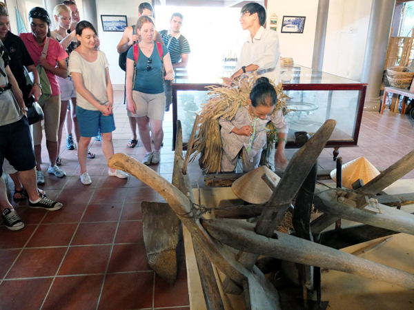 Después de pasar el puente se ve la casa de exhibición, donde hay cientos de instrumentos agrícolas, relacionados con las actividades de cultivo de arroz de agua como arados, trillos, hoces y molinos de arroz, además de los utensilios de pesca como redes, nasas y recuerdos de bambú y mimbre. El guía turístico Nguyen Thanh Trung, agregó: “Aquí podemos presenciar el proceso de producción de arroz desde la siembra hasta la cosecha, procesamiento y molienda. Especialmente a los niños les gustan mucho estas actividades. Además, los adultos pueden probar comidas sabrosas de la aldea mientras los niños y niñas pueden participar en las actividades cotidianas muy afectuosas e interesantes.”