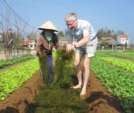Generalmente los excursionistas llegan de Hoi An a Tra Que en bicicletas. En los últimos más de l0 años, los lugareños han visto a los viajeros extranjeros trabajando voluntariamente como cultivadores de verduras. Realmente las yerbas buenas cultivadas según la tecnología limpia les atraen. La agricultora Do Thi Thanh dijo: “Las hortalizas de Tra Que son aromáticas con hojas pequeñas. Después de 20 días de siembra se pueden recoger. Me especializo en el cultivo de persicaria y vendo al por mayor. Esta hierba se come con arroz y pollo, mejillones y otros platos mixtos. Si los visitantes quieren preparar el terreno, fertilizar y regar legumbres les enseñamos a hacerlo. En general a ellos les gusta mucho este trabajo agrícola.”