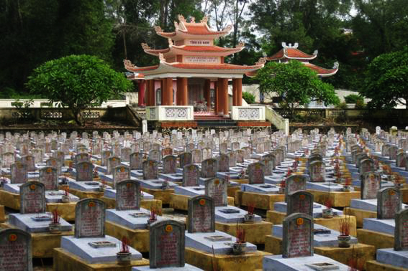 El mayor general Luong Sy Nhung, excomandante de la Agrupación l2-Truong Son predecesora del Cuerpo 559, quien participó en el diseño y construcción del cementerio, dio a conocer que después de la firma del Acuerdo de París en enero de l973, el Cuerpo 559 con el teniente general Dong Sy Nguyen a la cabeza, decidió construir una necrópolis para los mártires que fallecieron en dicha vía de transportación militar. Su edificación se inició el 24 de octubre de l975 y concluyó el l0 de abril de l977. “Según los cálculos iniciales unas 33 mil personas pertenecientes a las tropas de Truong Son cayeron allí. A la izquierda se encuentran las tumbas de los héroes, mártires y a los que aún no han sido identificados. A la derecha están los nichos de los combatientes de las provincias Quang Tri y Quang Binh. De acuerdo con la geomancia, el Campo Santo se sitúa en una buena posición compuesta por montículos de poca inclinación. Desde lejos se le ve semejando el vuelo de un águila. Frente al fosal hay un gran lago. En realidad más de 33 mil cuadros y combatientes murieron en ese camino, sin embargo, solo se pudieron recuperar l3 mil despojos y el resto fue barrido por bombas, proyectiles y lluvias”, reveló Nhung.