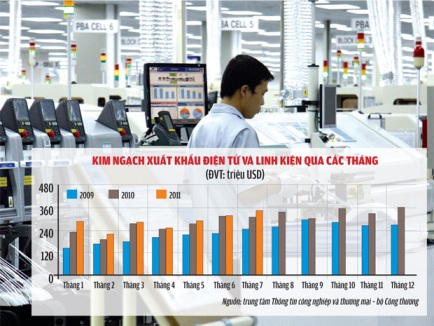 En los últimos tres años, la telefonía digital y los componentes electrónicos fueron incluidos en el tope de los 10 mayores productos exportables en volumen, que crece año tras año. De los 2 mil 760 millones de dólares obtenidos en 2009, su valor aumentó a 4 mil 660 millones en 2011 y hasta finales de agosto del presente año, las ventas de teléfonos y piezas de repuesto superaron los 7 mil 410 millones de dólares, mientras que en la electrónica se valora en 4 mil 760 millones. Se prevé que las exportaciones de los dos rubros sumarán de 15 a 16 mil millones de dólares. Tales cifras demuestran la certeza de la política del Gobierno vietnamita en convertir la industria electrónica en uno de los principales sectores económicos del país. Hace unos pocos años, Vietnam solo se dedicaba al montaje de artículos electrónicos convencionales para el mercado interno. Este país indochino, puede producir hoy componentes electrónicos para la exportación, diseñar y fabricar algunos equipos de alta tecnología informática bien reconocidos en mercados nacionales e internacionales. Nguyen Duc Thang, presidente de la Junta directiva de la empresa electrónica Tien Dat, informó: “En la actualidad, las facturaciones de productos electrónicos de Vietnam están creciendo rápidamente hasta un 50% al año. En 2011 se registró una cifra récord de exportaciones de 10 mil millones de dólares y se prevé alcanzar 15 mil millones de dólares este año. Se trata de un gran éxito de la industria electrónica de Vietnam.”