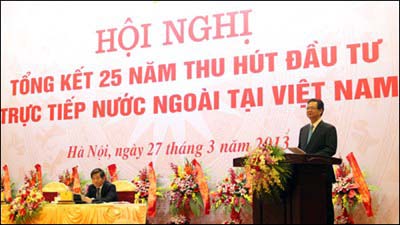 Vietnam ha empleado con eficacia este tipo de Inversión foránea con el empeño de mejorar la fisonomía económica en el proceso de integración internacional. Sin embargo, el país necesita superar deficiencias a fin de potenciar los recursos internos y crear confianza para los inversionistas extranjeros. Así lo pidió el primer ministro Nguyen Tan Dung en la reunión que evaluó los 25 años de apertura a la inversión extranjera directa en Vietnam. “Lo que hacemos ahora es promover la reforma de los procedimientos administrativos para ofrecer incentivos y beneficios a los inversionistas extranjeros. Además, debemos perfeccionar los documentos legales y las políticas de inversión para elevar la competitividad en comparación con otros países en la región”.