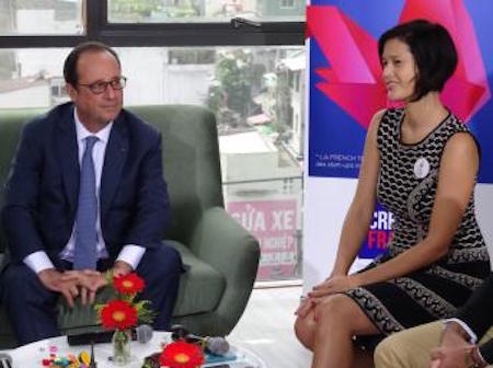 ![]() El presidente francés, François Hollande se encuentra con la representante del grupo de las empresas francesas incipientes en Vietnam (Frenh Tech Viet), Céline Zapolsky, durante su estancia en Vietnam |