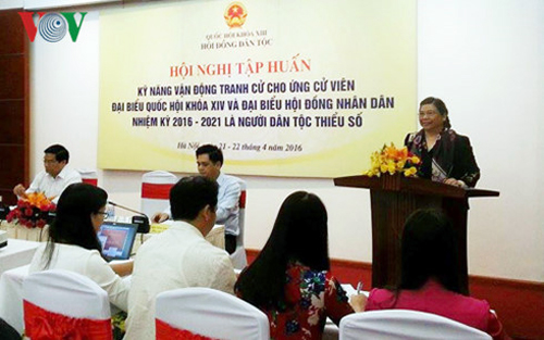 (VOVworld) – El Consejo Étnico del Parlamento vietnamita realizó este jueves una conferencia de entrenamiento de las técnicas para la campaña electoral de los 90 candidatos a diputados de la Asamblea Nacional, décimo cuarta legislatura y miembros de los Consejos Populares de 2016 a 2021. El taller de dos días está dedicado exclusivamente a representantes de minorías étnicas de 17 provincias norteñas del país.