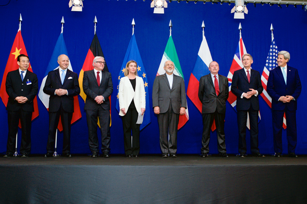 ![]() Los ministros de Relaciones Exteriores de Francia, Alemania, la Unión Europea, Irán, el Reino Unido y Estados Unidos, así como diplomáticos de China y Rusia anuncian el un acuerdo marco integral sobre el programa nuclear iraní (Lausana 2 de abril de 2015)