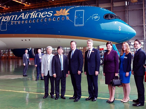 ![]() David Cameron y representantes de la aerolínea Vietnam Airlines con el avión de nueva generación Airbus A350
