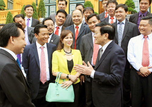 El presidente de Vietnam, Truong Tan Sang (d) alienta a los empresarios más sobresalientes del país a mejorar su operación para aprovechar las oportunidades que brinda la integración mundial