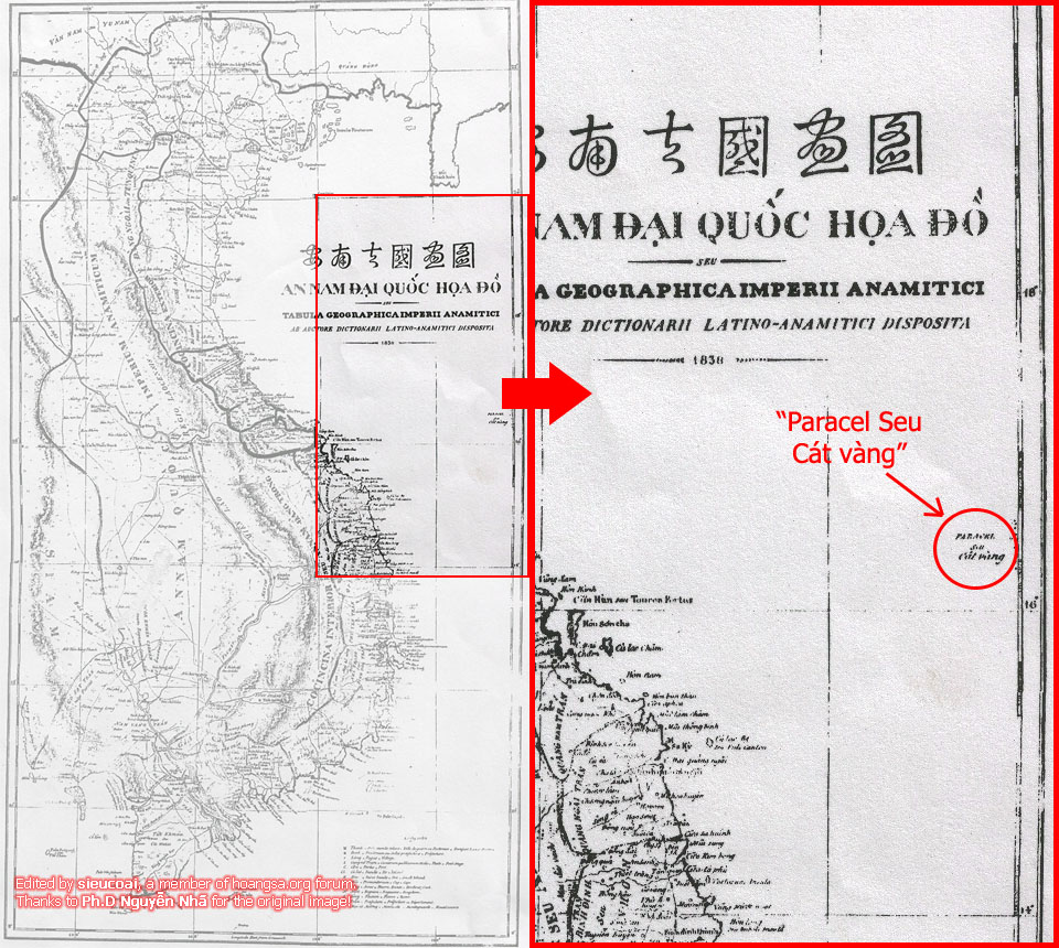 El último se basa en el An Nam Dai Quoc Hoa Do (mapa del gran imperio de An Nam) cartografiado por el obispo francés Jean Louis Taberd y publicado en 1838. Los lugares en este plano son anotados en vietnamita y latín. El archipiélago de Hoang Sa en este documento fue dibujado con coordenadas más coincidentes con su ubicación real, con una línea de explicación: “Paracel seu Cat vang” (o Paracel significa Arena Amarrilla (Hoang Sa)). El obispo francés Jean Louis Taberd además afirmó en un artículo en “The Journal of the Assiatic Society of Bengal) (revista de la Asociación de Asia en Bengala) que “El archipiélago de Hoang Sa pertenece a An Nam (entonces nombre de Vietnam).