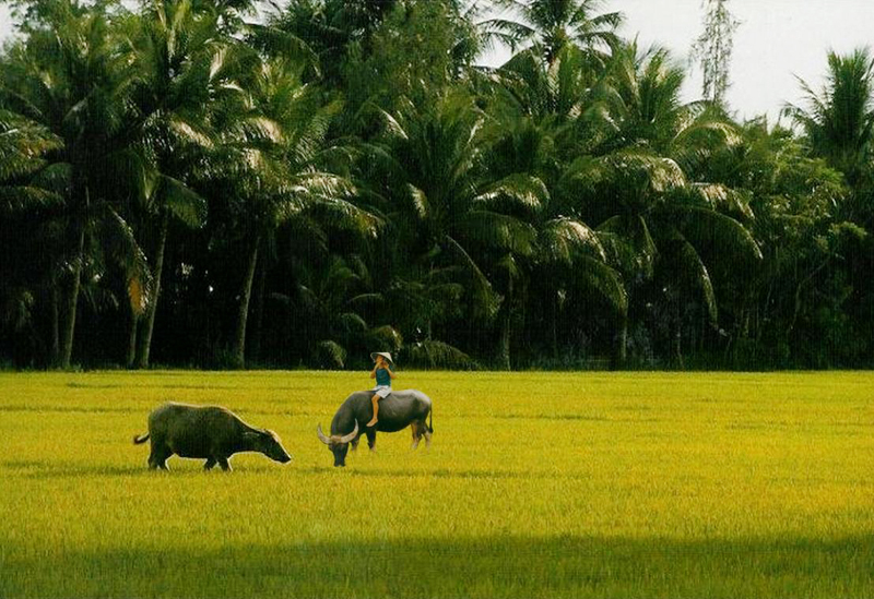 El campo de arroz maduro en el Oeste de la parte sureña de Vietnam (Cochinchina)