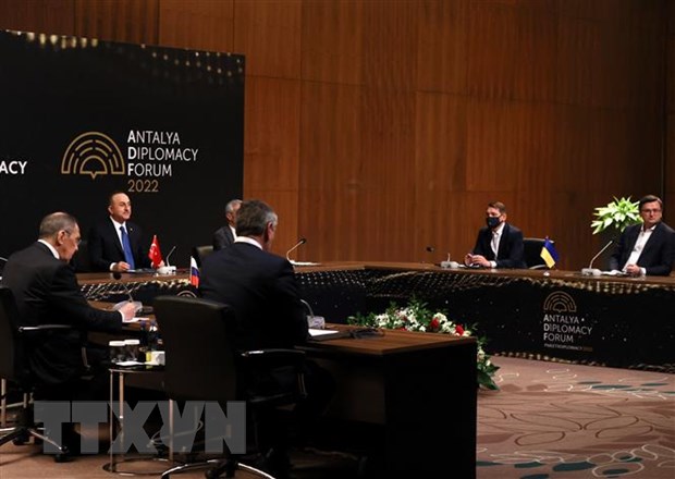 Los cancilleres de Rusia, Sergei Lavrov (i), de Ucrania, Dmytro Kuleba (d.), y de Turquía, Mevlut Cavusoglu, en las negociaciones en Adalia, el 10 de marzo de 2022. (Foto: AFP/ VNA) |