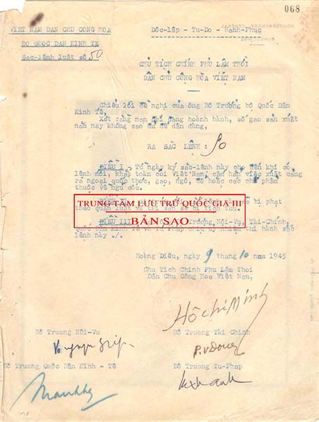 El Decreto N° 50 de fecha de 9 de octubre de 1945, el primer documento legal de la República Democrática de Vietnam en que aparece la línea: “Independencia - Libertad - Felicidad". |