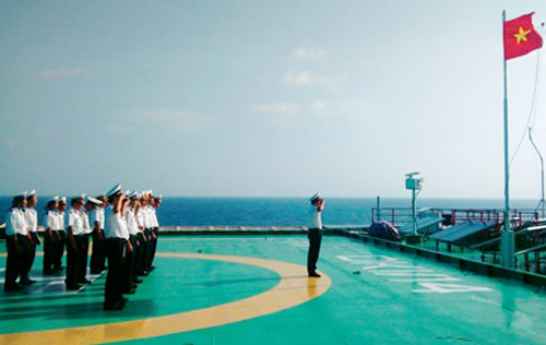 Soldados de la plataforma DK 1 saludan a la bandera nacional