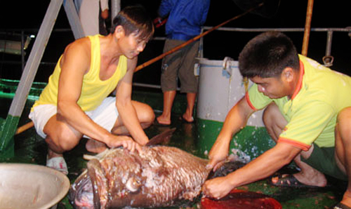 Combatientes en islas sumergidas Truong Sa procesan peces para un convite
