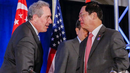 ![]() El ministro de Industria y Comercio de Vietnam, Vu Huy Hoang (d) y el representante del Departamento de Comercio de Estados Unidos, Michael Froman después de la última ronda de negociación del TPP