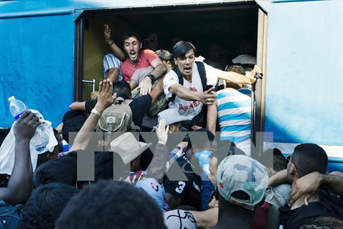 ![]() Migrantes empujan para subirse a un tren lleno rumbo a la frontera entre Macedonia y Grecia